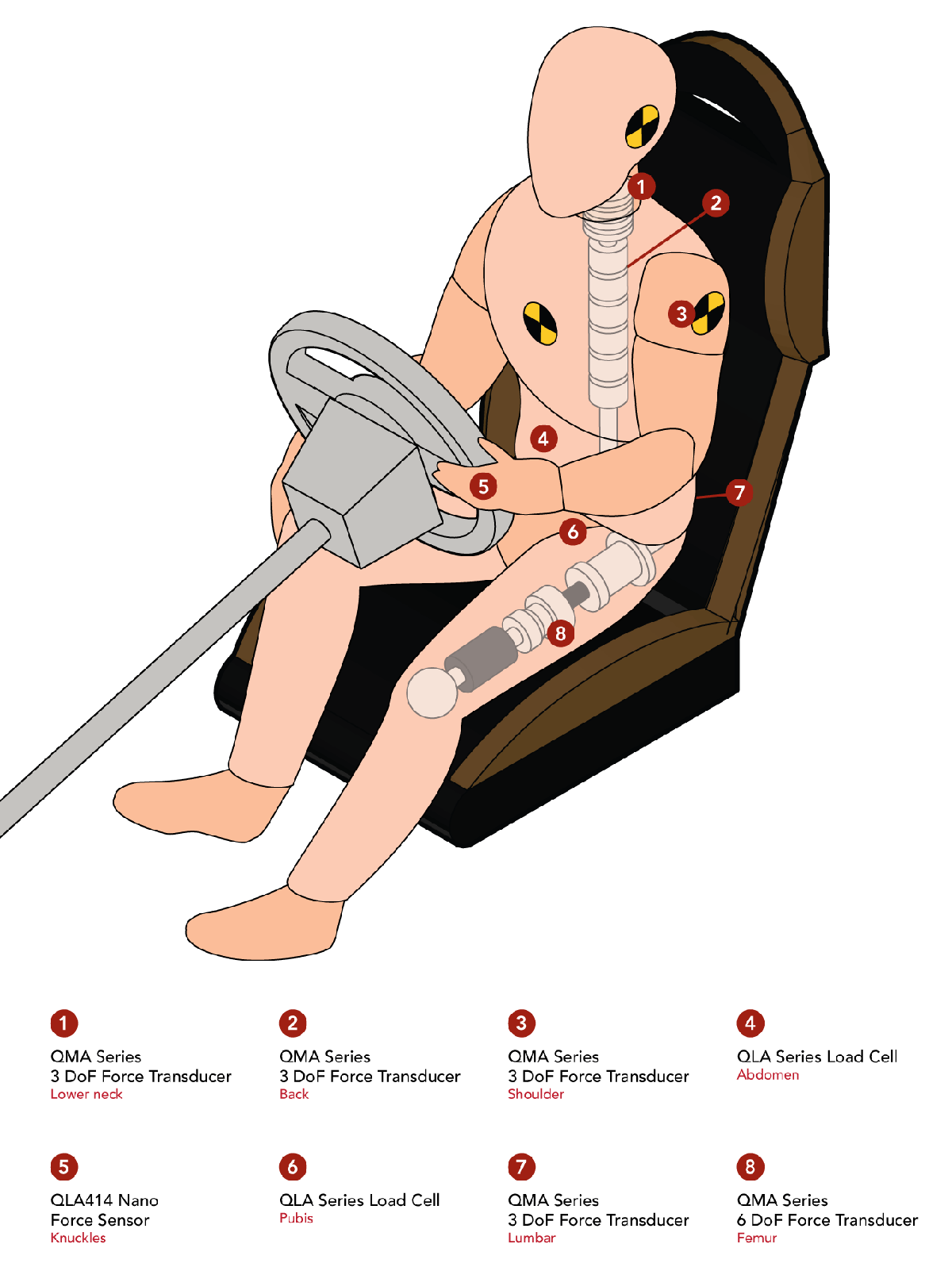 碰撞试验用的人体模型 – 通常也叫做试验假人 (ATDs) – 是一种用在交通碰撞试验中反馈人体所遭受伤害的高精度汽车试验装置。 它可以模拟出在发生交通碰撞事故时人体各部位和关节所遭受力的方向和程度。在试验假人身体关键部位和肢体关节处安装有碰撞测试用的传感器, 同时装配有采集系统, 以记录不同情况碰撞时部位产生的偏移、 加速度和力。 例如, 试验假人躯干处的传感器记录其受到碰撞的合力程度和方向。 研究员和测试工程师用记录到的数据来分析和预测在碰撞中人体受到的伤害, 并研发更安全和更符合人体工程学的交通工具。在开发出碰撞试验假人之前, 曾经用过人类尸体、动物或者活人来测试交通碰撞时的安全性。 后来工程师们掌握了在假人模型上集成传感器来测量碰撞时力、 加速度、 冲击和位移的技术, 他们才能更好的去预测人体这样的伤害, 比如肋骨骨折、 胸部偏移、 脑震荡、 肢体骨折、 肌肉和软组织的伤害。一个碰撞试验假人上, 遍布集成有超过200个传感器, 包括力传感器、 扭矩传感器、 加速度传感器、 位移传感器。这类模型中具体会用到哪些传感器呢?在试验假人中, 世界杯网页版_世界杯(中国)、 力-扭复合型传感器是少不了, 比如他们通常位于头颈、 背脊、 肩关节、 腹部、 指关节、 耻骨、 腰部和腿骨等部位。力-扭多轴传感器能及时地测出试验假人在多个方向受到的力矩大小和方向, 比如六轴传感器能测三维互相垂直的力 (Fx, Fy, Fz)、 以及绕着力方向产生的扭力 (Mx, My, Mz), 并转换成可测量的电子信号。世界杯网页版_世界杯(中国)提供了大量的力-扭传感器选项, 非常适合碰撞试验假人的应用。世界杯网页版_世界杯(中国)对内的技术精湛多样的工程师团队同时开发出了先进的、 独特的、 性能可靠的传感器和输出来满足你的应用需求。 世界杯网页版_世界杯(中国)力-扭多轴碰撞测试传感器符合美国国家高速公路交通安全管理局FMVSS 208的试验程序和安全要求。