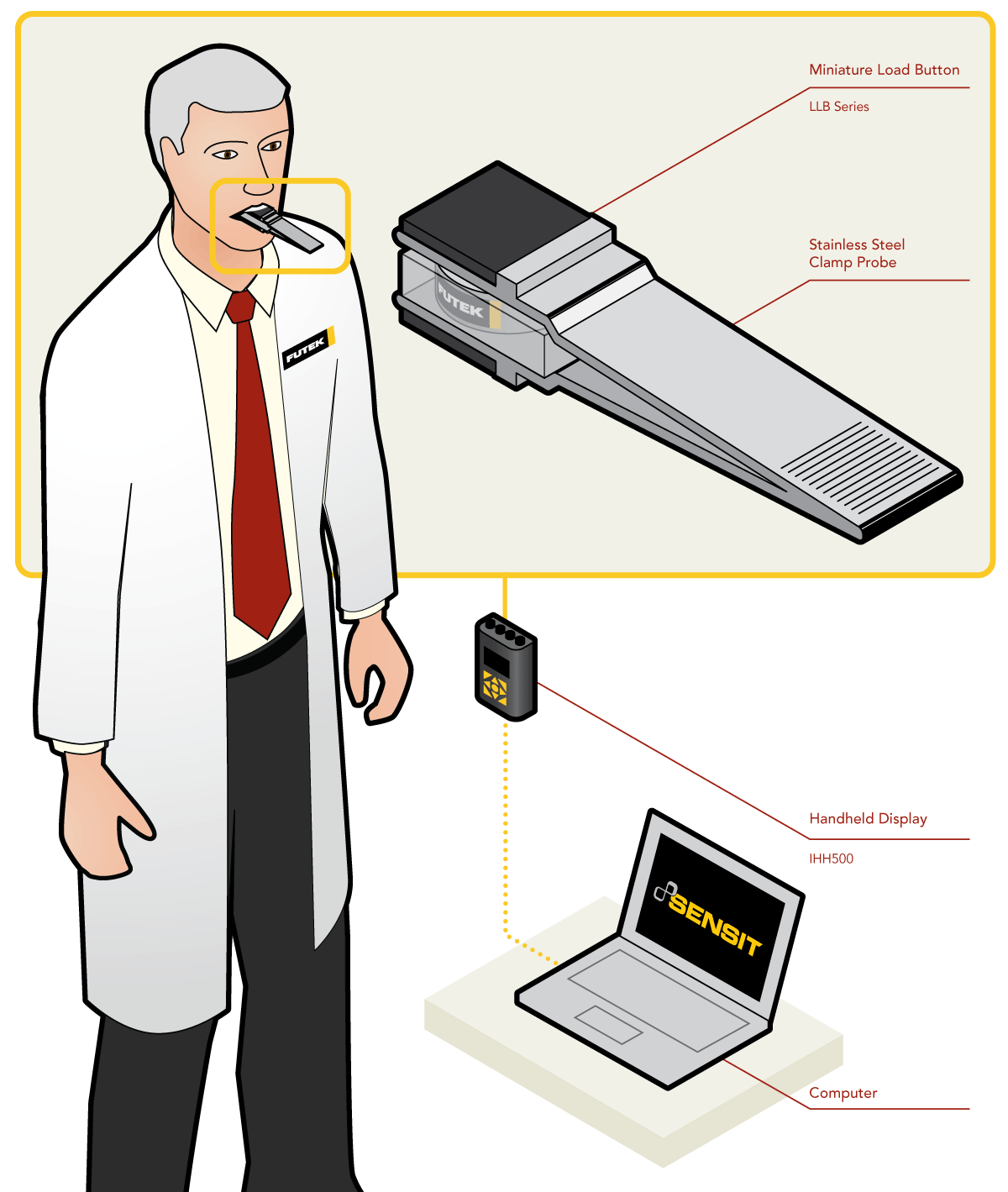 2、当患者咬合夹块,传感器受力的输出信号,连接到世界杯网页版_世界杯(中国)的IHH500手持式显示仪表中,研究人员从仪表监测数值。显示仪表可配置世界杯网页版_世界杯(中国) SENSIT采集软件,运行这个软件,研究人员可实时显示曲线、储存数据。