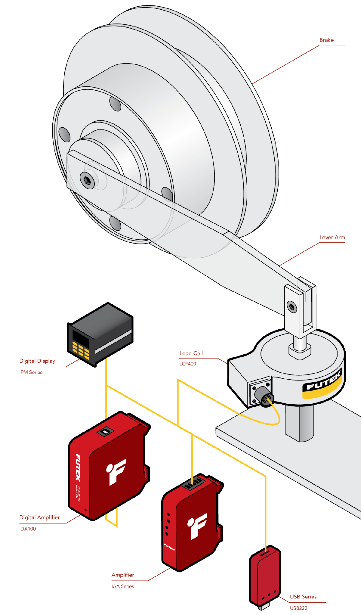 2、手臂末端与LCF400 传感器连接起来,以测量制动器在抵抗运动时产生扭矩时通过手臂产生的力,充当扭矩负载单元传感器。