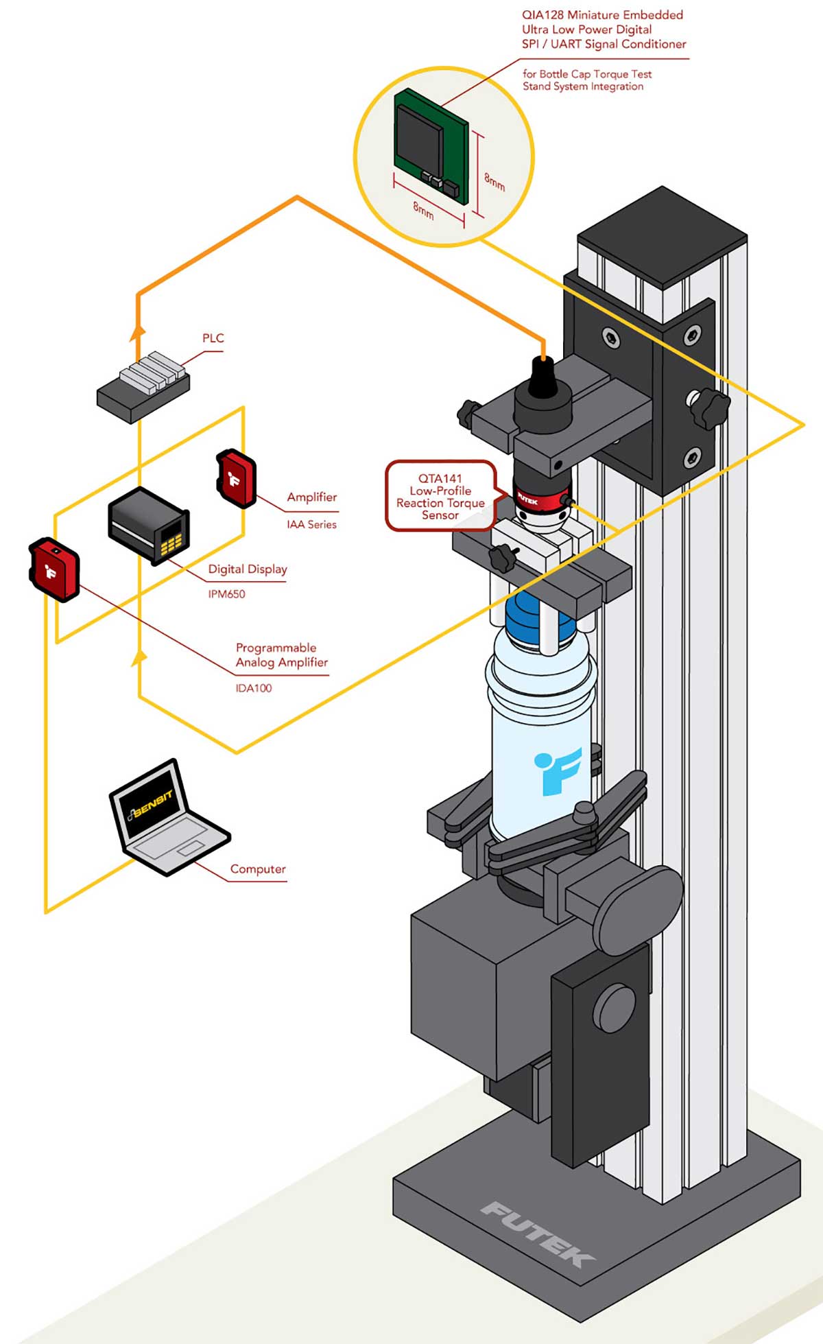 1、反作用扭矩传感器与瓶盖扭矩试验台夹具集成在一起,以监控用于旋转瓶盖的扭矩。