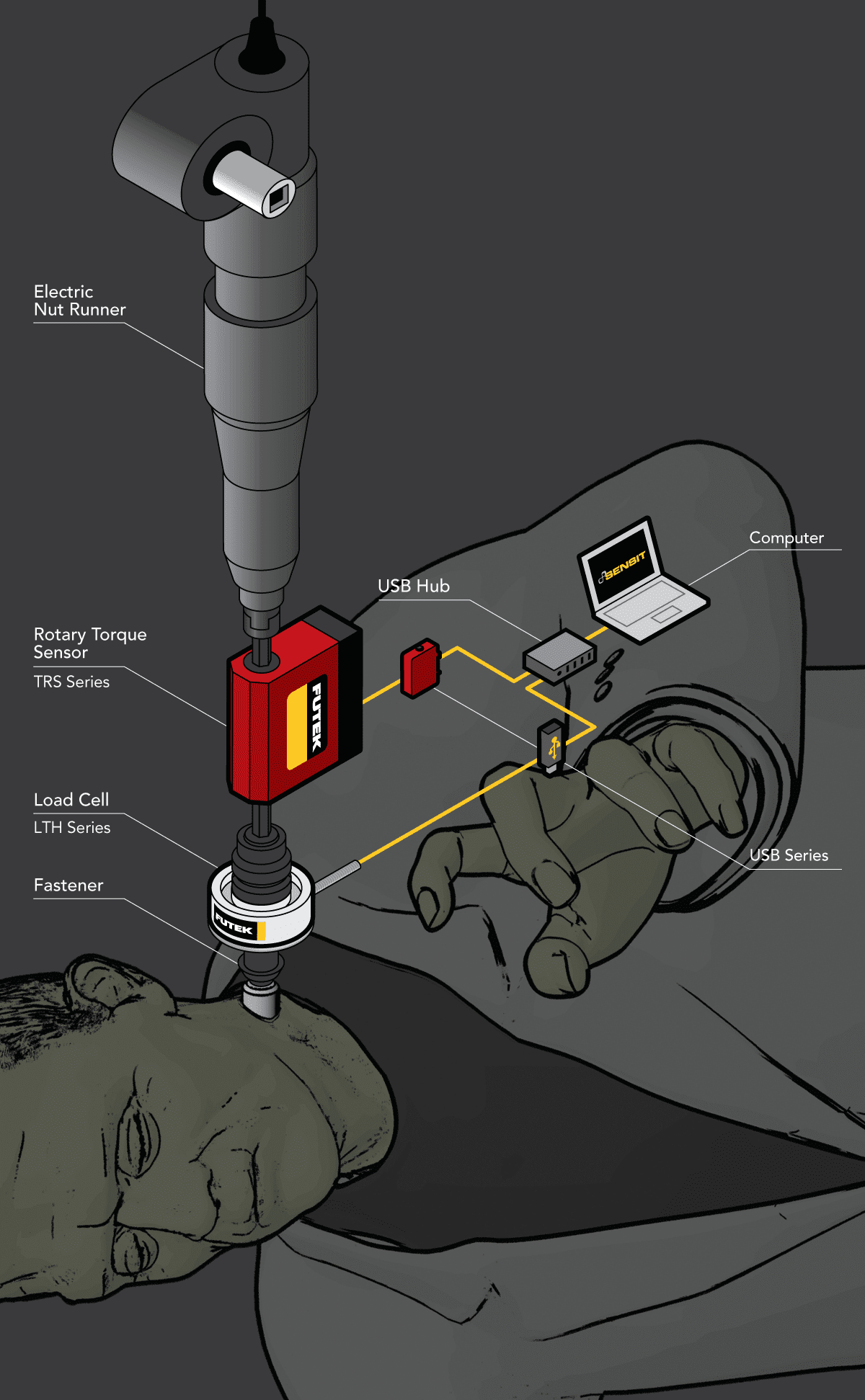 驱动:电动螺丝刀/电机,扭力传感器:世界杯网页版_世界杯(中国)的TRH605,测力传感器:世界杯网页版_世界杯(中国)的中空型LTH系列,信号处理:世界杯网页版_世界杯(中国)的USB520和IDA100,终端显示:世界杯网页版_世界杯(中国)的SENSIT软件、PLC