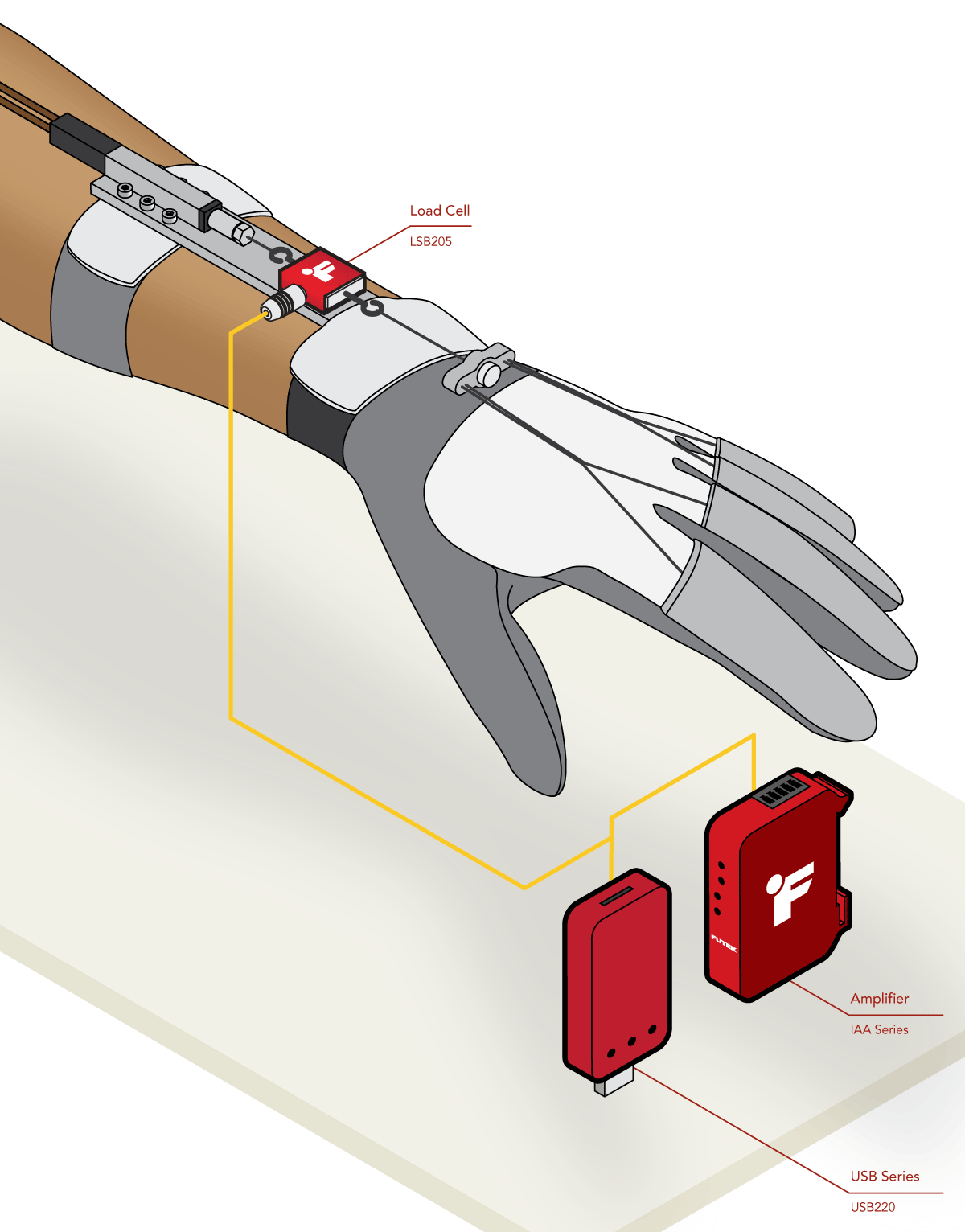 1、传感器通过两端螺纹孔固定在肌腱仿真丝上, 做好信号处理模块的连接。打开软件实时显示,连接传感器时要留意数值变化以适度施力。
